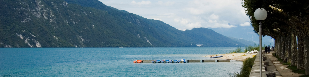 Depuis le petit port d’Aix-les-Bains, une promenade piétonne longe le lac. Les paysages sont magnifiques, entre montagnes environnantes et eaux scintillantes.